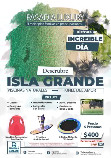 Rumbo a Colón busca mejorar la satisfacción del cliente y la mejora continua de los servicios. Creemos en el potencial de la Costa Arriba para convertirse en el principal destino turístico de Panamá y estamos dedicados a hacer realidad este sueño. Juntos, construiremos recuerdos inolvidables y dejaremos una marca positiva en cada visita a la Costa Arriba.